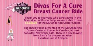 You are welcome to join us to deliver the funds to MD Anderson Cancer Center at Cooper on November 14th. We will depart from Barb’s H-D Parking lots at 1:30PM for a 2:00PM arrival time at MD Anderson Cancer Center at Cooper.